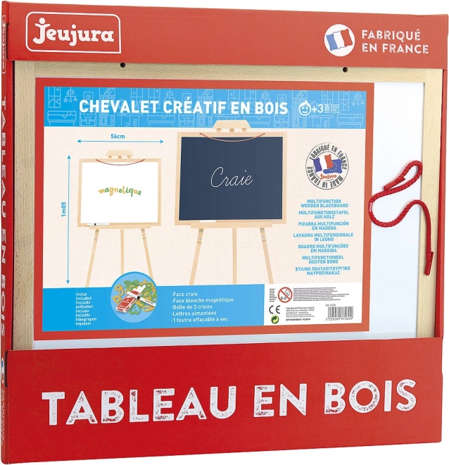 Jeujura dřevěný stojan s multifunkční tabulí nabízí univerzální prostor pro kreslení i psaní. Oboustranná tabule je vhodná pro křídy i fixy, což zajišťuje široké využití při hře a učení. Dřevěný stojan je vybaven odkládacím prostorem, kam si děti mohou uložit potřebné pomůcky. Součástí balení jsou tři křídy, fix a sada psacích magnetických písmen.