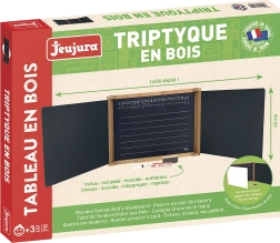 Multifunkční trojkřídlá tabule JEUJURA je skvělou volbou do dětského pokoje, herny i školky. Nabízí černou psací plochu pro křídy a bílou tabuli pro suché popisovače, které lze snadno setřít plstěnou houbičkou. Centrální díl černé tabule je linkovaný a obsahuje předlohy psacího písma, takže děti mohou trénovat správný tvar písmen.