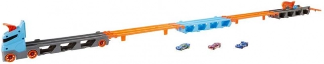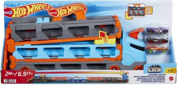 Se závodním přepravcem 2v1 od Hot Wheels můžete snadno ukládat a vystavovat až 20 autíček díky malým okénkům v návěsu. Když nastane čas pro závod, přepravce se po rozložení mění na 1,8 metru dlouhou závodní dráhu. Vozidla zůstávají viditelná pod dráhou a kabina kamionu se promění v dvojitou odpalovací rampu pro dva vozy.