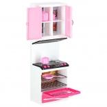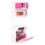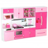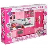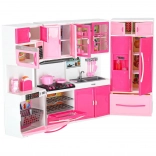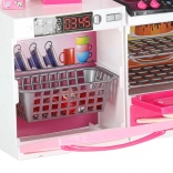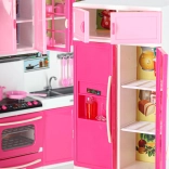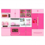 Stylová růžovo-bílá kuchyňka pro panenky se skládá ze čtyř modulů s led podsvícením hořáků a zvukovými efekty. Nabízí otevírací dvířka, mikrovlnku, troubu, zmyvačku, lednici i dřez a bohaté příslušenství pro realistickou hru na vaření a organizaci kuchyně.