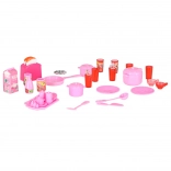 Sestava zahrnuje mikrovlnku a myčku, sporák s troubou, vitrínu se dřezem i lednici se zásuvkou. Děti si užijí kompletní scénář vaření, pečení i uklízení.