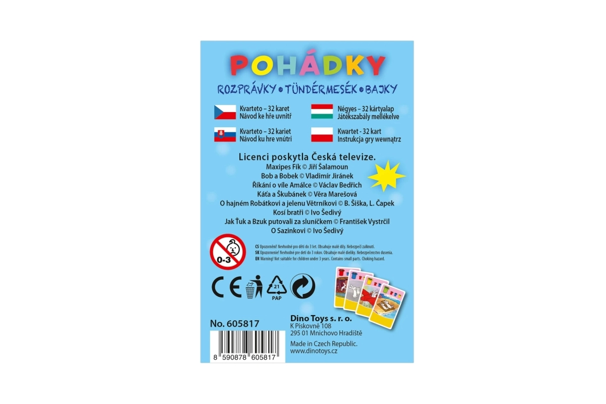 Užijte si klasickou karetní hru s oblíbenými postavičkami z českých večerníčků. Hajný Robátko, Bob a Bobek nebo víla Amálka provázejí děti zábavným kvartetem, které rozvíjí logické myšlení, kombinační schopnosti a komunikační dovednosti. Ideální pro 3–6 hráčů, jednoduchá pravidla a rychlé partie zaručí spoustu radosti doma i na cestách.