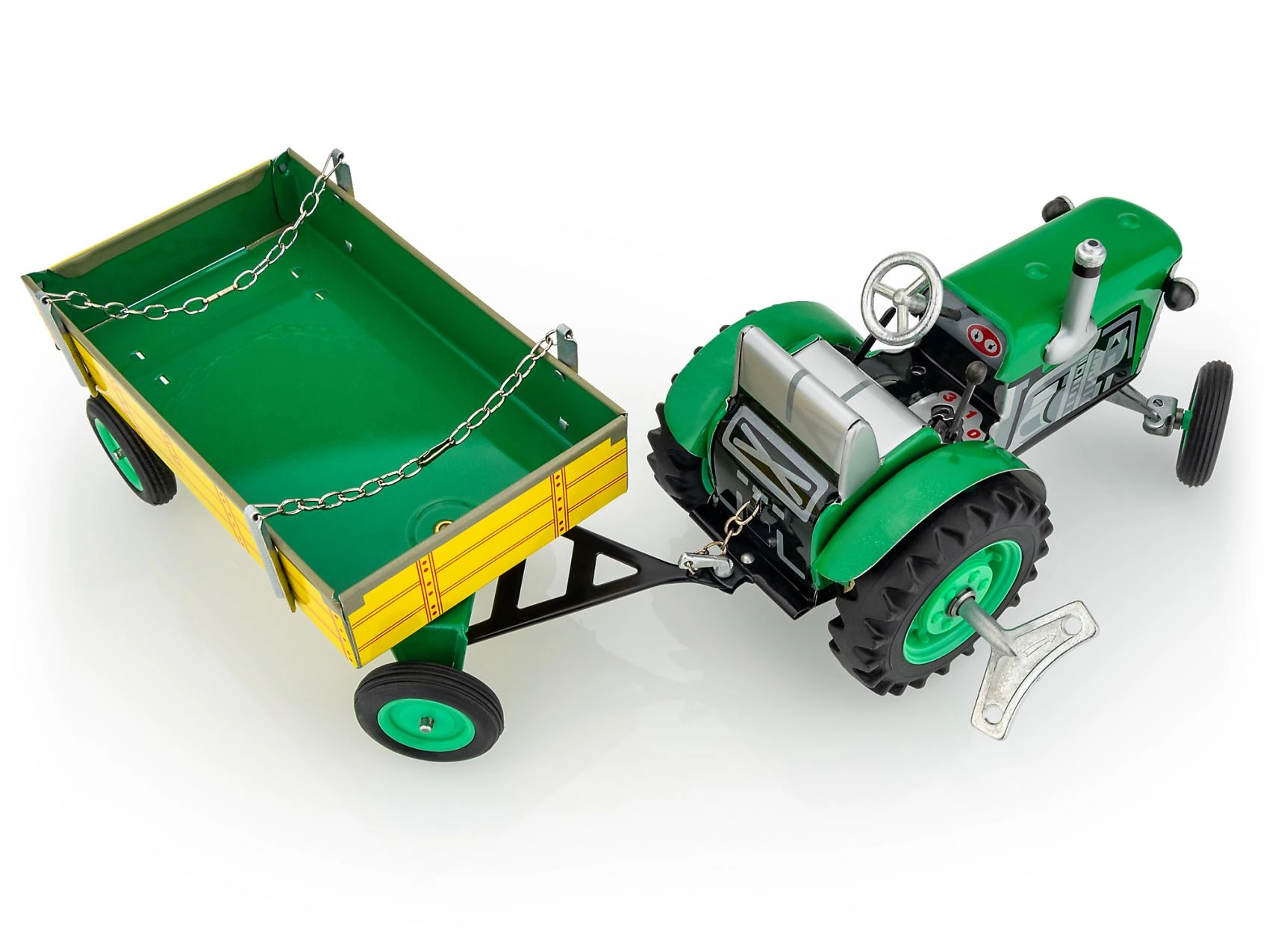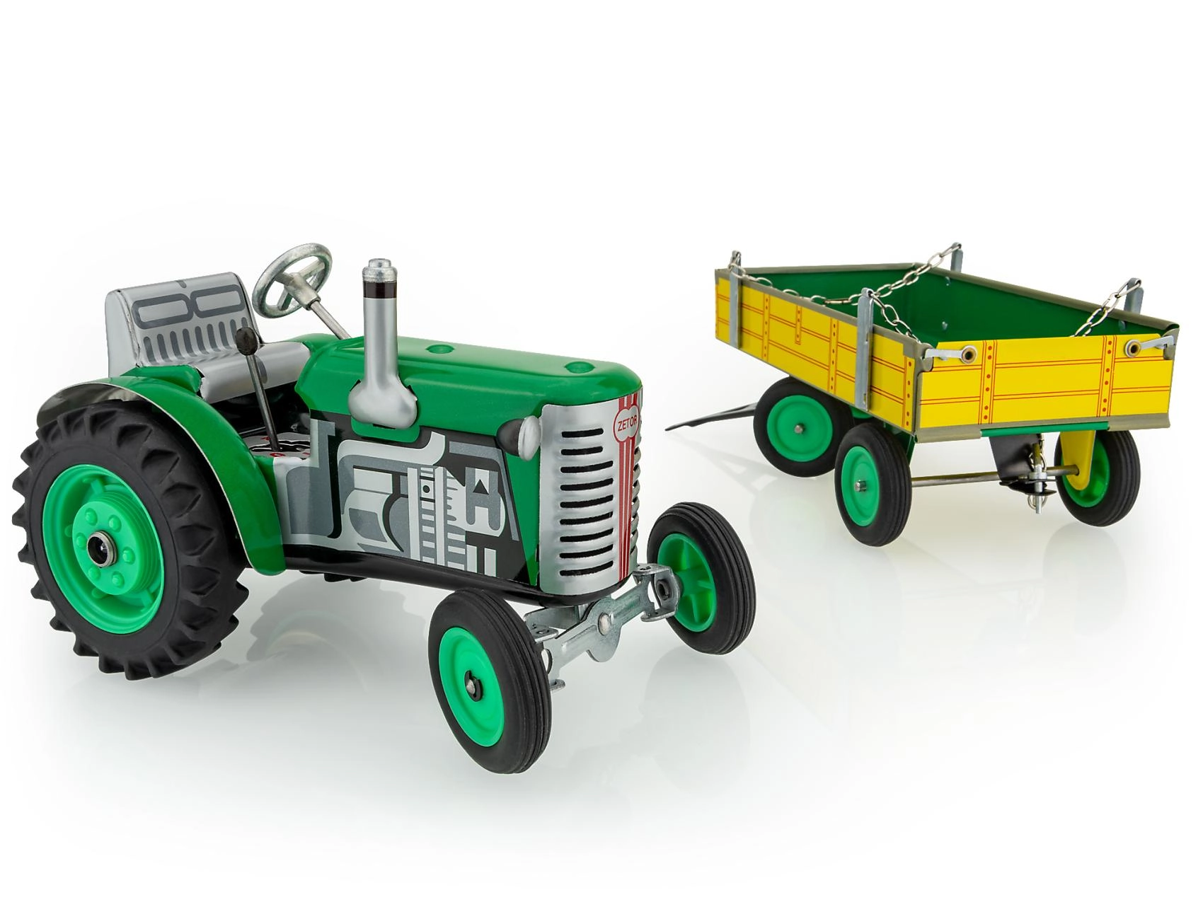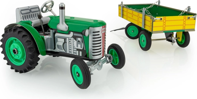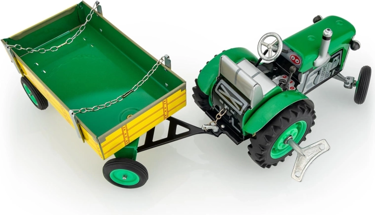 Kovový traktor Zetor s valníkem od značky KOVAP potěší malé i velké fanoušky zemědělské techniky. Pohon zajišťuje pérový strojek na klíček, nechybí funkční převodovka se 3 rychlostmi vpřed a zpátečkou, řízení volantem ani ruční brzda. V měřítku 1:25 a délce 28 cm nabízí autentický zážitek z jízdy i sběratelskou hodnotu.