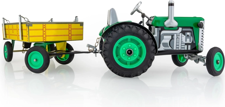Objevte poctivý český model traktoru Zetor s valníkem, vyrobený z kovu s důrazem na detaily a odolnost. Díky pérovému strojku na klíček se traktor skutečně rozjede, zatímco funkční převodovka umožní volit tři rychlosti vpřed a zpátečku. Děti mohou traktor ovládat volantem a bezpečně zastavit pomocí ruční brzdy.