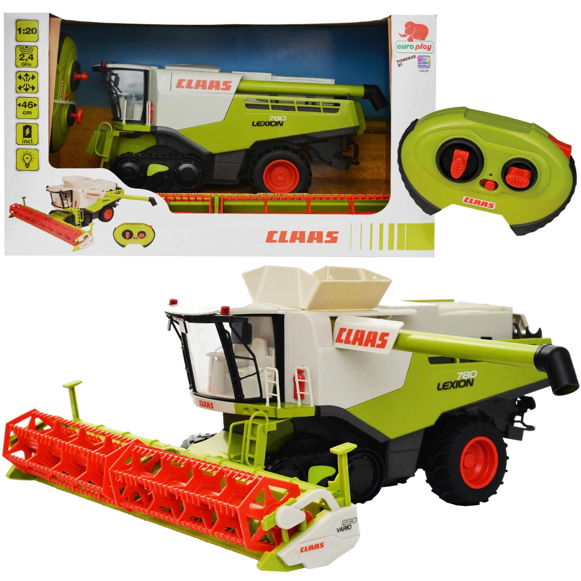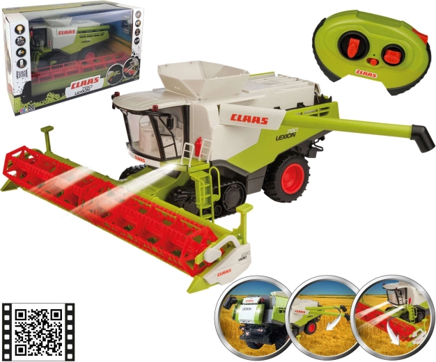 RC kombajn CLAAS LEXION 780 potěší malé fanoušky zemědělské techniky i sběratele. Robustní zpracování, autentické barvy a loga CLAAS, prosklená kabina a detailní tělo působí jako věrná miniatura skutečného stroje. Dvě zadní gumová kola a přední pásy zajišťují stabilní jízdu, zatímco odnímatelný žací adaptér s otáčivým rotorem přináší ještě realističtější zážitek ze sklizně.