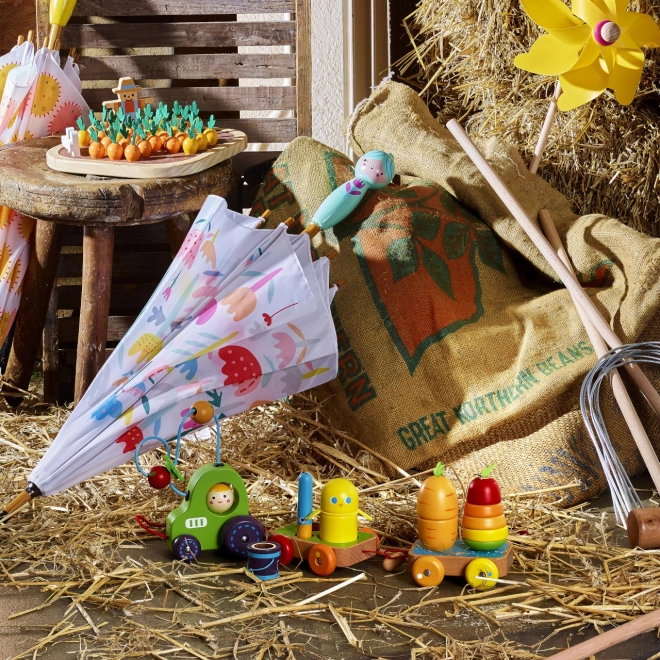 - Posuvné korálky: Traktor má korálky na drátku ve tvaru ovoce, které podporují motorické dovednosti.