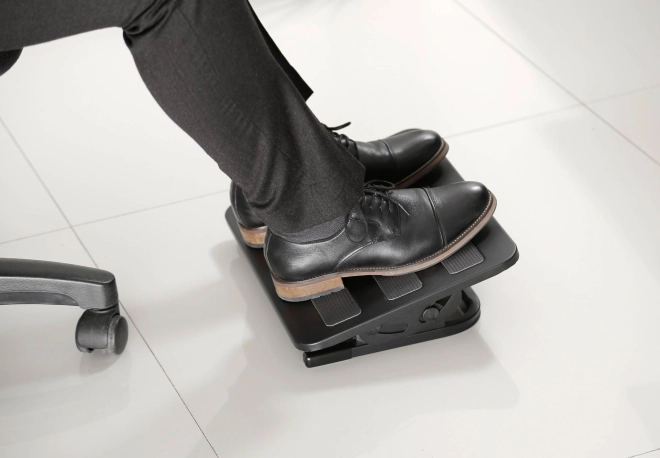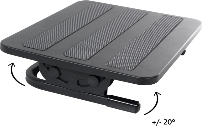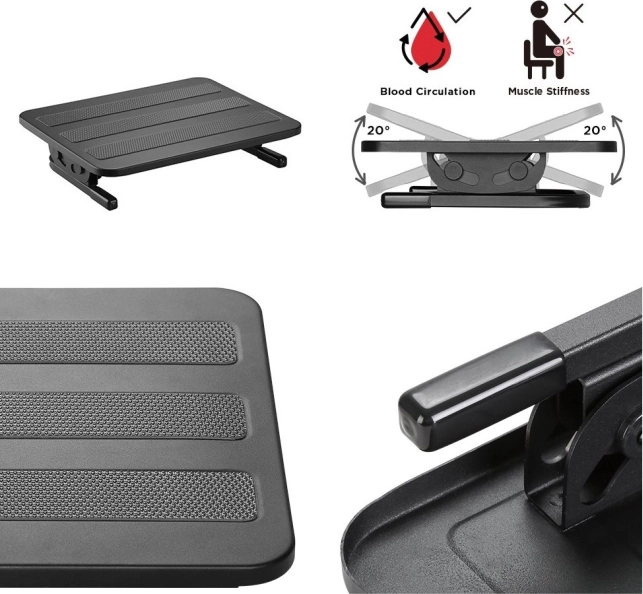Ergonomická podnožka MACLEAN MC-831 z pevné kovové konstrukce nabízí plynulou regulaci sklonu v rozsahu +20° / -20° a tři protiskluzové pásy pro jistou oporu. Díky rozměrné ploše 380 × 300 mm zlepšuje ergonomii sezení, ulevuje zádům a podporuje lepší krevní oběh při dlouhém sezení v kanceláři i u počítače.