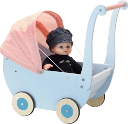 Malé maminky teď mohou své panenky svézt ve stylovém, elegantním, ale i prostorném kočárku v barvách Petitcollin. Je vybaven praktickou sklápěcí stříškou, opečovávanému miminku tak za příznivého počasí nebude nic bránit ve výhledu a vnitřní prostor bude vždy snadno dostupný. Kola jsou vybavena gumovými návleky, kočárek se proto pohybuje tiše na všech typech povrchů. Svou decentní barevností využívající odstíny modré a růžové vkusně doplní další z řady příslušenství Petitcollin. Je dodáván již z větší části sestavený a po jednoduché montáži madla připraven k jízdě. Hlavní vlastnosti:sklápěcí stříškatichý a kultivovaný chodatraktivní dřevěné zpracování