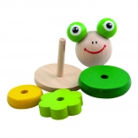 Houpací pyramida Žabáková je skvělá dřevěná hračka pro rozvoj motoriky a představivosti malých dětí. Skládá se ze 4 navlékacích dílů a jednoho základního dřevěného dílu s tyčkou, díky čemuž zábavně poskakuje a točí se.