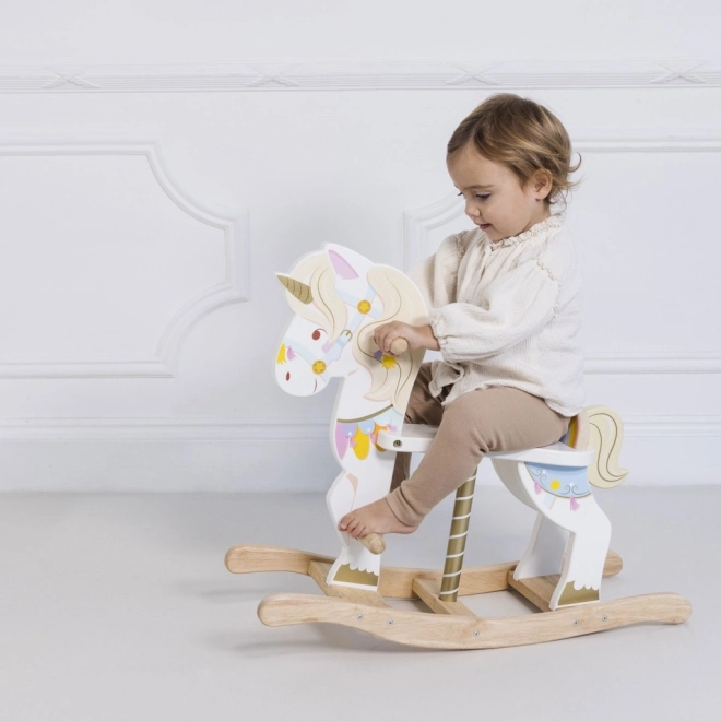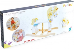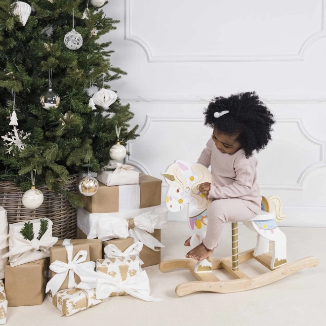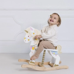 Houpací jednorožec LE TOY VAN z kolekce Petilou je klasická hračka v moderním pojetí. Díky pevnému dřevěnému základu a promyšlené ergonomii podporuje přirozené houpání, rozvíjí koordinaci, rovnováhu a jistotu v pohybu. Bohaté barevné detaily, zlatý roh a milý výraz podněcují fantazii i radost ze hry.