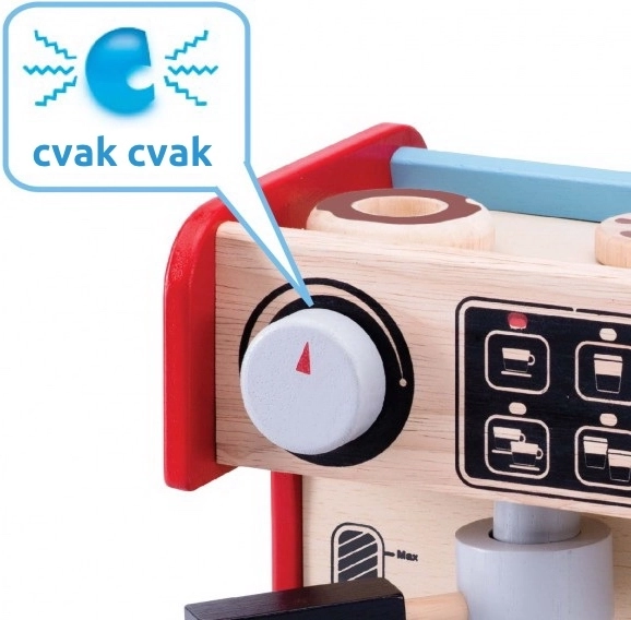 Děti si s tímto kávovarem mohou vyzkoušet, jaké to je být baristou. Souprava zahrnuje kávovar s odnímatelnou pákou a pohyblivým dávkovačem mléka. Vše je doplněno o ovládací displej s otočným cvakajícím knoflíkem a malovanými tlačítky.