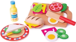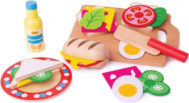 V sadě najdete vše pro přípravu chutného sendviče: bagetku, plátky chleba, majonézu, salát, okurku, sýr, vejce a rajče, doplněné o talíř, prkénko a nůž. Materiály pocházejí z odpovědných zdrojů a hračka splňuje evropské bezpečnostní normy, takže se na ni můžete spolehnout.