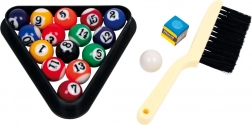 Součástí balení je vše potřebné pro začátek hry: dvě tága, koule, trojúhelník a křída. Tento mini stůl je navržen tak, aby poskytl realistický zážitek na malé ploše.