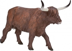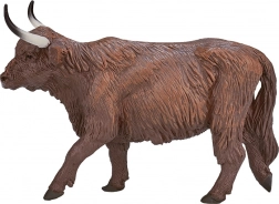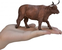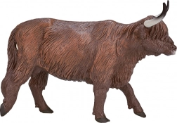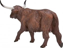 Detailní plastový model Skotského náhorního býka s dlouhou texturou srsti a výraznými rohy.