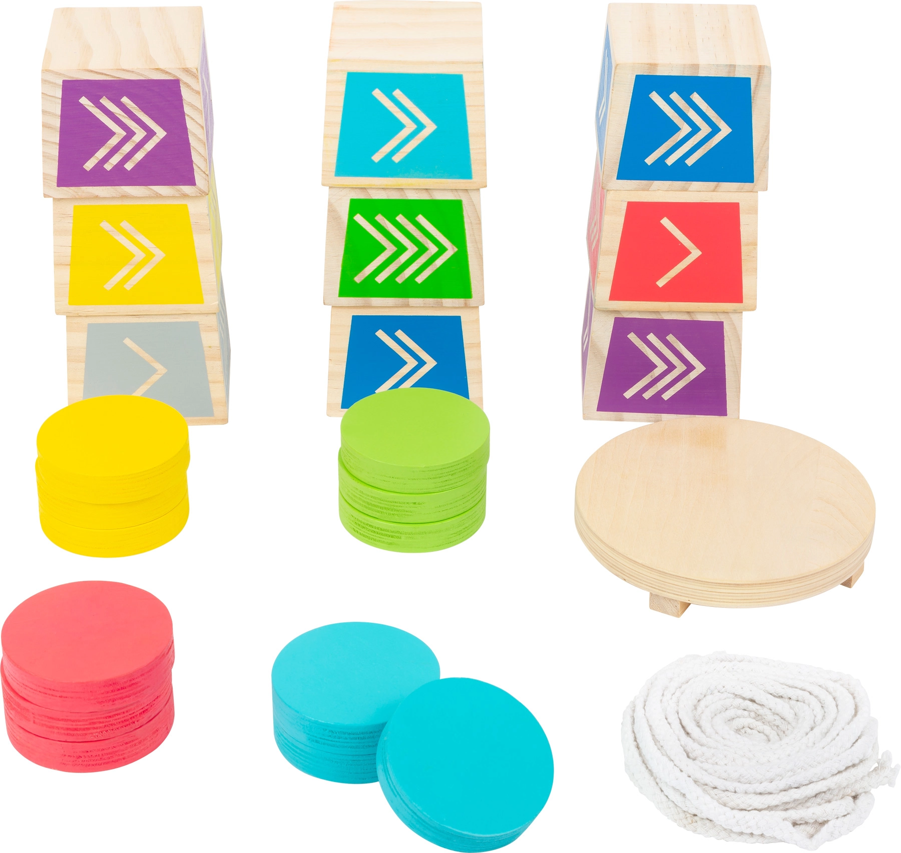 Rodinná venkovní hra ze 100% FSC dřeva pro 2–4 hráče, inspirovaná stylem Kubb. Cílem je shodit vrchní kostku z věže pomocí barevných disků – trénuje přesnost hodu, koordinaci a prostorové vnímání. Ideální pro děti od 5 let a férové soutěžení na zahradě i v parku.