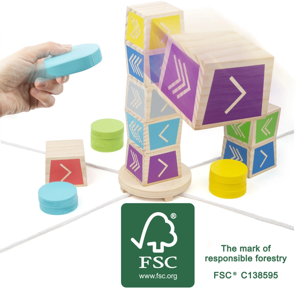 Užijte si akční zábavu s rodinou a přáteli. Tato dřevěná dovednostní hra ve stylu Kubb potěší jednoduchými pravidly a napínavým průběhem – úkolem je shodit pouze vrchní kostku z postavené věže barevnými disky. Díky kvalitnímu provedení ze 100% FSC dřeva je hra odolná, bezpečná a šetrná k přírodě.