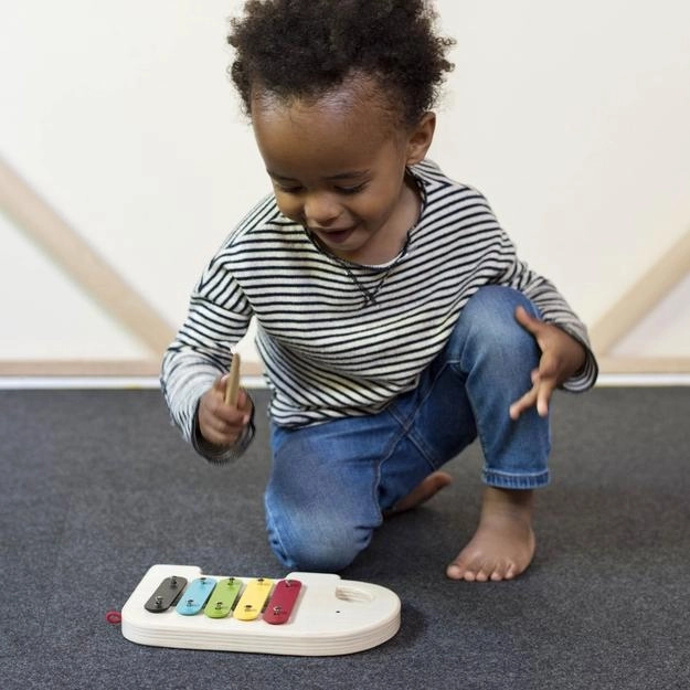 Díky masivní dřevěné konstrukci a bezpečným materiálům je xylofon ideální volbou pro batolata. Palička je opatřena elastickým úchytem, takže ji děti jen tak neztratí a hra může pokračovat kdykoli a kdekoli.