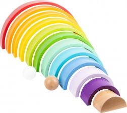 14 barevných oblouků lze skládat do duhy, mostů, tunelů i věží. Děti si trénují rovnováhu a představivost při každé nové kombinaci.