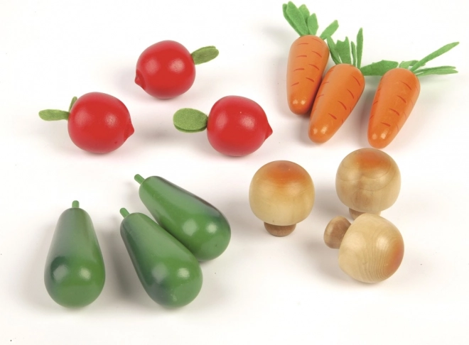 Sada obsahuje výběr oblíbené zeleniny – mrkev, cuketu, rajče a houby – uložené v odolné dřevěné přepravce. Vše je pečlivě vyrobeno z kvalitních a zodpovědně získaných materiálů, bezpečných pro dětské hraní.