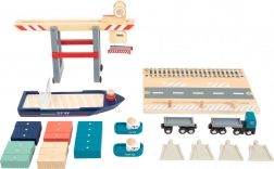 Tato promyšlená přístavní stavebnice přináší dětem realistickou hru na logistiku: loď s dvěma remorkéry je připravena k vyplutí, zatímco jeřáb překládá barevné kontejnery díky integrovaným magnetům. Robustní dřevěné díly a plynulé funkční prvky podporují jemnou motoriku, představivost a trpělivost.