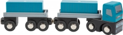Modrá loď s barevnými kontejnery a dva remorkéry propojené provázkem přinášejí realistickou hru na mořskou dopravu.