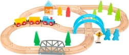 Souprava zahrnuje lokomotivu s vagónky, most, domeček, stromy, figurky a dopravní prvky pro realistické scénáře. Přirozené dřevo v kombinaci s výraznými barvami působí atraktivně a podporuje smyslové vnímání. Díky kompatibilitě s dalšími dřevěnými systémy mohou děti snadno rozšiřovat svět kolejí.