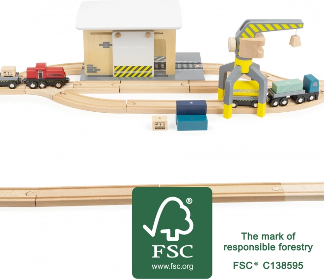 Tato bohatě vybavená dřevěná sada přináší dětem autentický svět nákladní železnice. Otočný jeřáb snadno přemísťuje magnetické bloky a kontejnery, posuvná stěna s integrovanou kladkou umožňuje flexibilní manipulaci a vláček s magnetickými přívěsy rozváží zboží po rozmanité trati z 25 dílů. Vše je vyrobeno z certifikovaného FSC dřeva pro dlouhou životnost a bezpečné hraní.