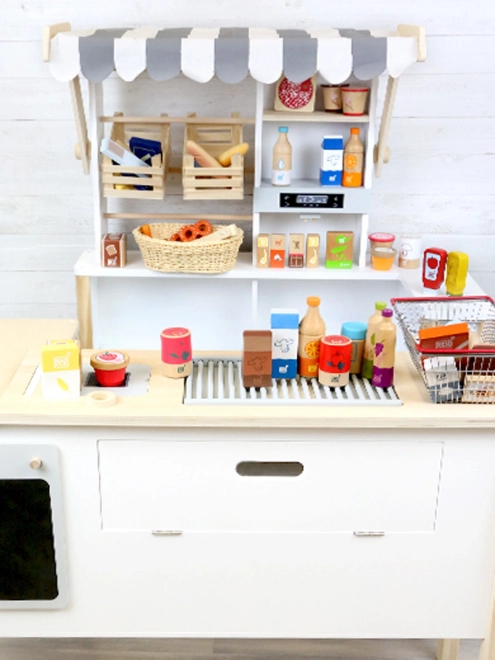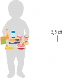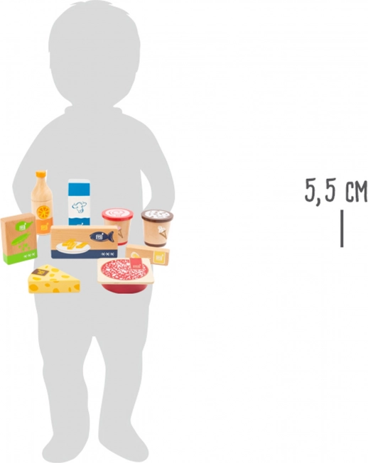 Set obsahuje pomerančový džus, dvě balení zmrzliny, balení hrášku, rybí prsty, máslo, sýr, krájený salám a krabici mléka. Realistické potisky a přírodní vzhled zaujmou na první pohled. Díky pevnému dřevu je sada odolná a připravená na každodenní hraní.