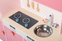 Dětská dřevěná kuchyňka Gourmet růžová je ideálním herním centrem pro malé šéfkuchaře. Disponuje sporákem, dřezem, pračkou, myčkou nádobí, lednicí, mikrovlnkou a horkovzdušnou troubou. Aktivní hraní rolí a sociální interakce je podporována díky realisticky ilustrovaným ovládacím panelům a hračkám s magnetickým zavíráním a cvakajícími knoflíky.