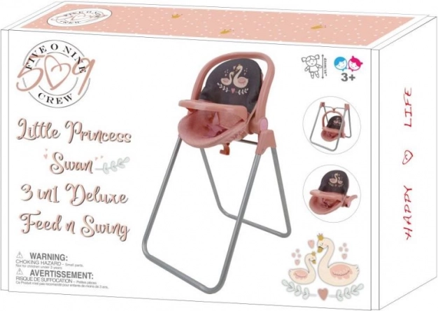 Roztomilá sada pro panenky 3 v 1 s motivem labutě kombinuje jídelní židličku, houpátko a autosedačku/vajíčko pro panenky do cca 46 cm. Stabilní konstrukce z plastu a kovu, bezpečnostní pásek a snadné přestavění zaručují realistickou hru na rodiče už od 3 let.