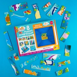Objevte zábavnou sadu pro nejmenší: progresivní dětské puzzle CAROTINA Baby se 8 sadami puzzlů s rostoucí obtížností. Díky speciální podložce je skládání i ukládání dílků snadné, velké a odolné kartonové dílky jsou bezpečné pro děti od 1 roku. Tématika mořského světa rozvíjí jemnou motoriku, logické myšlení a vizuální vnímání.