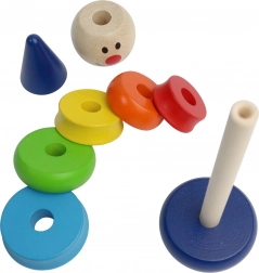 Díky různým velikostem kroužků si děti trénují jemnou motoriku, logické uvažování a trpělivost. Pestré barvy podporují vizuální vnímání a učení barev a pořadí. Dřevěné provedení zaručuje odolnost a bezpečné hraní.