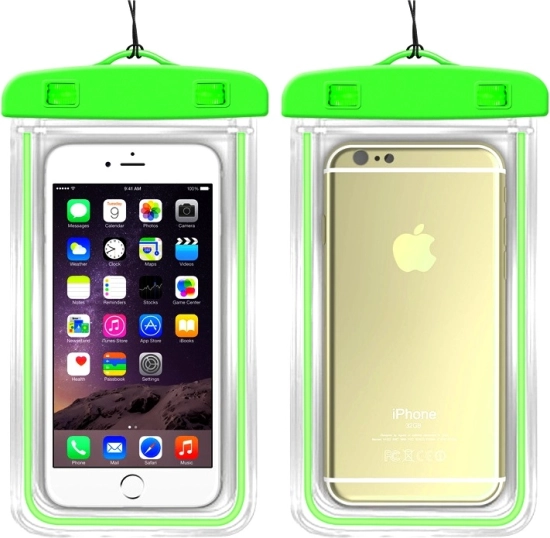 Součástí obalu je popruh pro zavěšení na krk. Přední strana je celá průhledná a nebrání v ovládání dotykového displeje. Na zadní straně je menší „okénko“ pro pohodlné focení i pod vodou nebo v silném dešti.