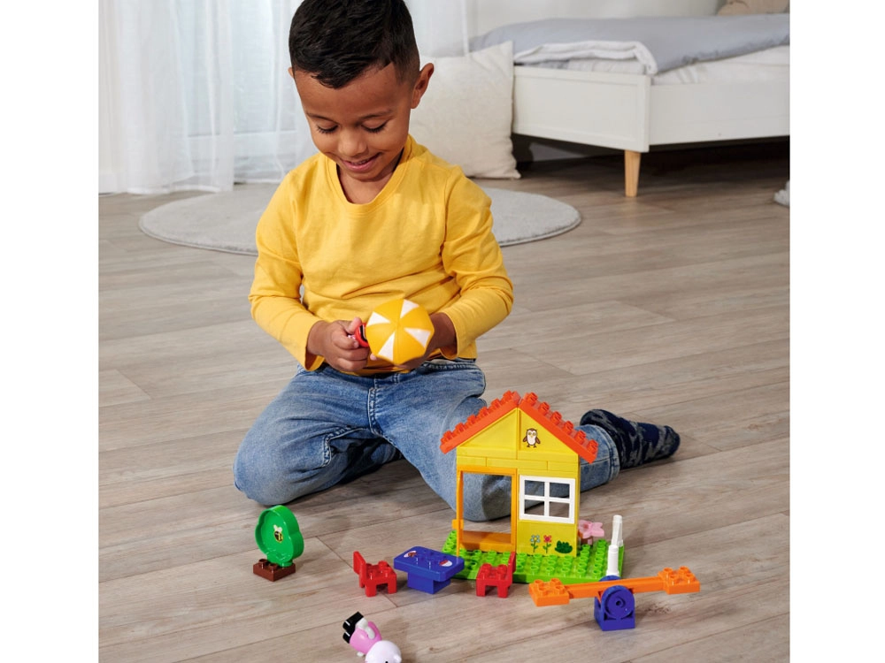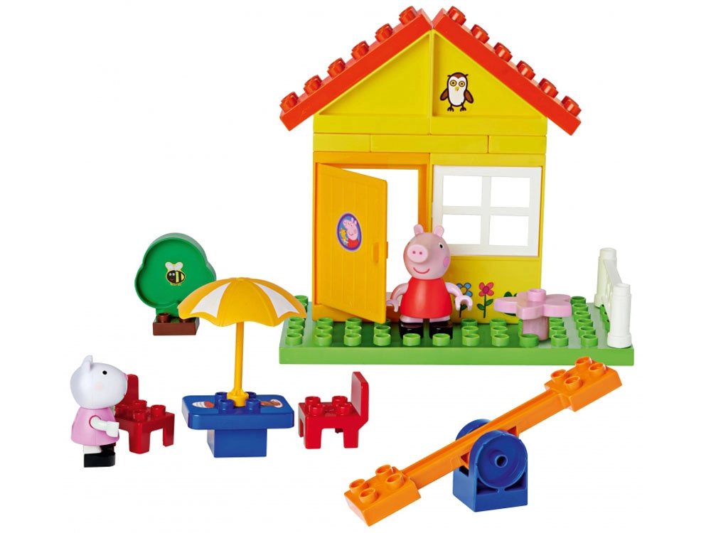 Postavte si roztomilý domeček se zahrádkou a doplňky a užijte si hodiny zábavné hry ve světě PEPPA PIG. Sada obsahuje 26 dílků v pestrých barvách a dvě figurky – Peppu a Suzy – které vybízejí k tvoření vlastních příběhů a scén.