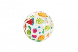 Transparentní míč zdobí barevné potisky ovoce, zmrzlin, rybek a mořských motivů. Motiv je vybírán náhodně, vždy ale zaručí veselý vzhled a dobrou viditelnost ve vodě i na pláži.