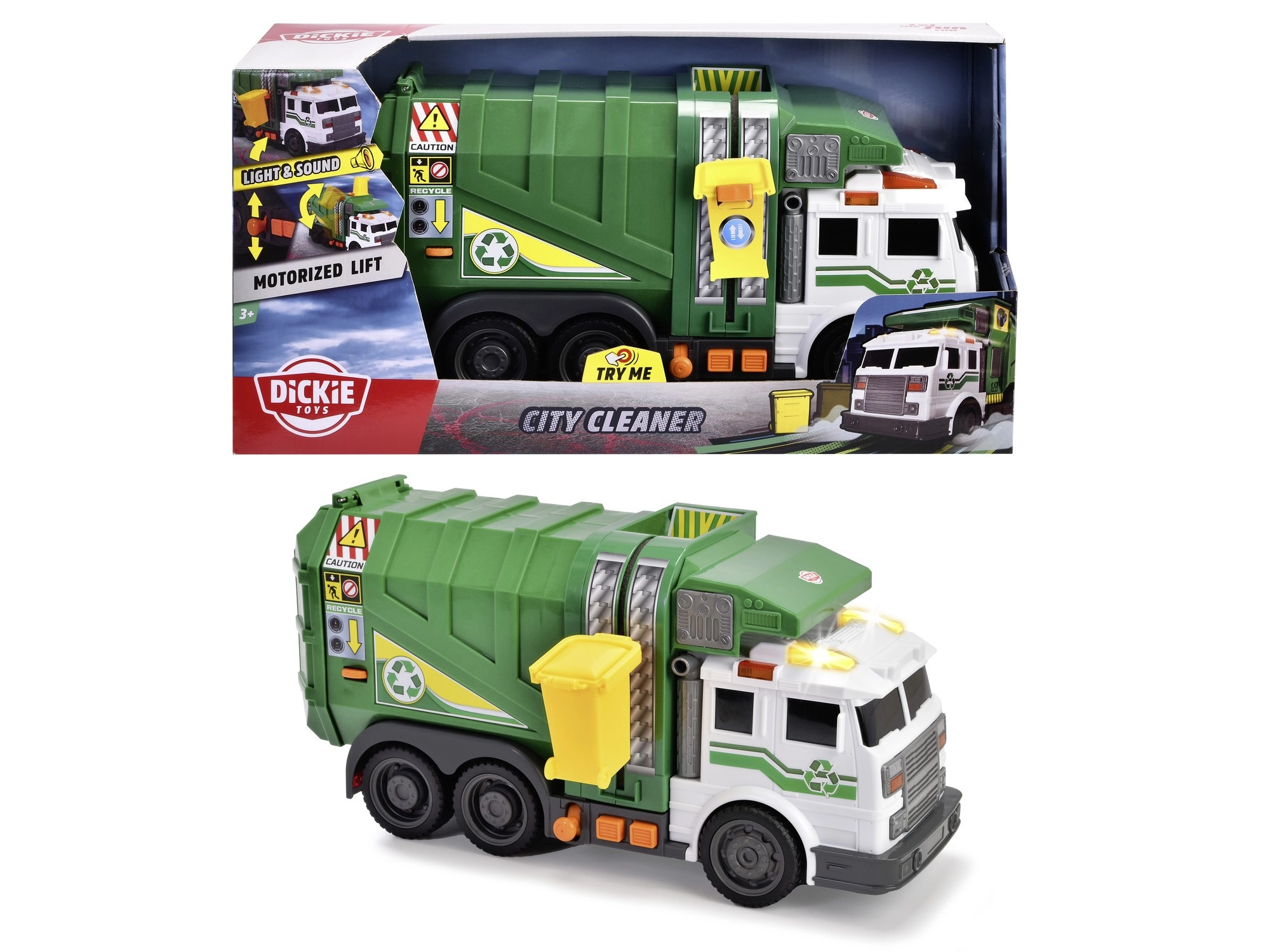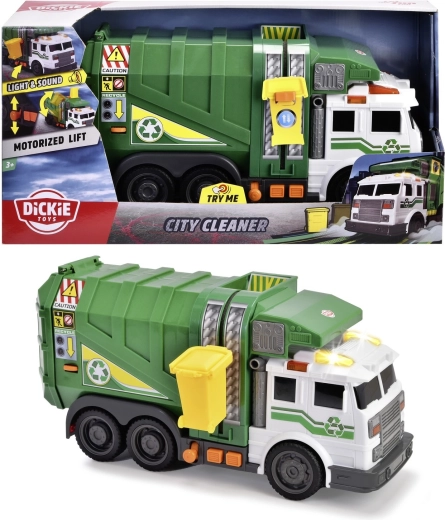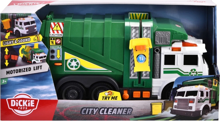 Realistické zelené popelářské auto City Cleaner od Dickie Toys nadchne děti světly a zvuky, funkčním zvedákem na žlutou popelnici a pohyblivými částmi. Skvělá hračka pro hraní na svoz odpadu, učení o recyklaci a rozvoj jemné motoriky.