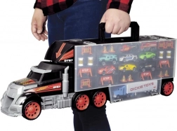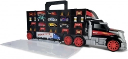 Obří kamionový kufřík kombinuje úložný box a herní set v jednom. Otevíratelné přihrádky pojmou celou sadu vozidel i doplňků a praktická rukojeť usnadní přenášení. Manuální launchovací mechanika v kabině promění kamion v závodní dráhu a postará se o akční starty.