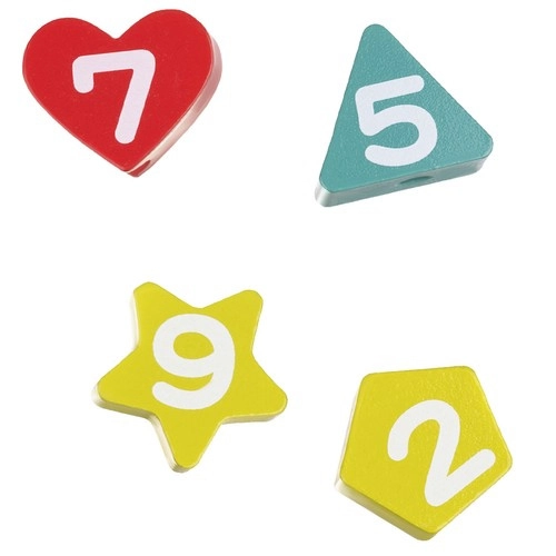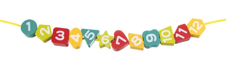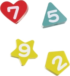 Součástí je šňůrka s dřevěným úchopem. Navlékání číslic procvičí trpělivost, soustředění i obratnost prstů.