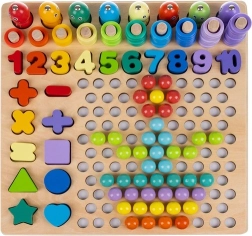 Tato komplexní dřevěná vzdělávací sada kombinuje mozaiku s korálky, skládání tvarů i magnetické rybaření. Děti si hravou formou procvičí počty, třídění barev a rozpoznávání tvarů, zároveň rozvíjejí jemnou motoriku a úchop pomocí pinzety, hůlek a lžičky. Vhodné pro samostatnou hru i společné učení s rodiči.