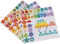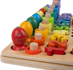 Set obsahuje oboustranné předlohy, číslice, matematické symboly a barevné kroužky i kuličky pro stavění vzorů. Díky dřevěnému základu je hračka odolná a stabilní, pestré barvy motivují ke kreativitě a dítě si snadno osvojí základy matematiky.