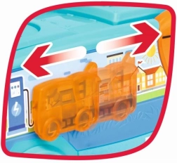 Děti mohou otevírat dveře a hýbat bočním prvkem, což podporuje jemnou motoriku a realistické scénky z města.