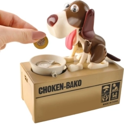 Zábavná interaktivní pokladnička CHOKEN-BAKO ve tvaru pejska, který „jí“ mince z misky. Skvělý způsob, jak děti hravou formou vést k šetření. Po vložení mince se pes rozpohybuje a vydá zvuk – minci spolkne do boxu. Funguje na baterie 2× AA. Kompaktní rozměry a bezpečné plastové provedení ABS/PS dělají z této pokladničky stylový doplněk do dětského pokoje i originální dárek. Učí děti spořit, realistický pohyb a zvuk, jednoduché vyjímání mincí.