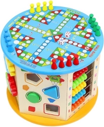 Horní část s korálkovým bludištěm lze využít pro trénink úchopu a jemné motoriky, boční panely pak nabízejí tvarový sorter, ozubená kolečka, počitadlo, čísla, bludiště a další aktivity. Spodní strana ukrývá stolní hru „Člověče, nezlob se“ s figurkami a kostkami v balení – ideální pro společnou rodinnou zábavu.