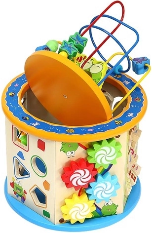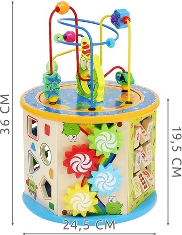 Kuličkový labyrint, tvarový sorter, ozubená kolečka, počítadlo, čísla, hodiny, bludiště a herní panel – vše v jedné stabilní kostce.
