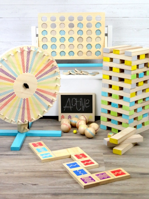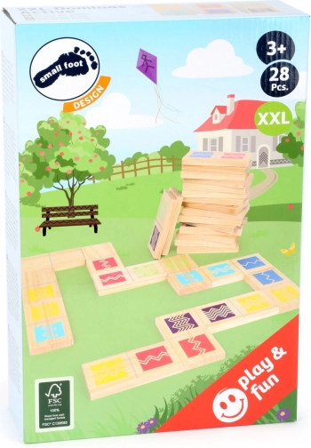 Domino XXL Active od small foot je nadčasová společenská hra v maxi provedení, která zabaví děti i dospělé. Každý dílek je vyroben ze 100% FSC certifikovaného dřeva a zdoben výraznými barvami i šrafovanými vzory. Hrát můžete podle barev i dle šrafování – děti si tak trénují zrakové rozlišování, soustředění a strategické myšlení.