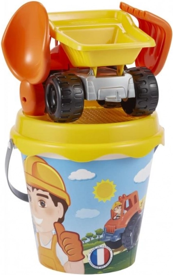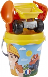 Zábavná sada na písek pro malé stavitele obsahuje kyblíček, sítko, nákladní autíčko, hrabičky a lopatičku. Ideální na hřiště i pláž, s průměrem kyblíčku 17 cm a výškou 18 cm.