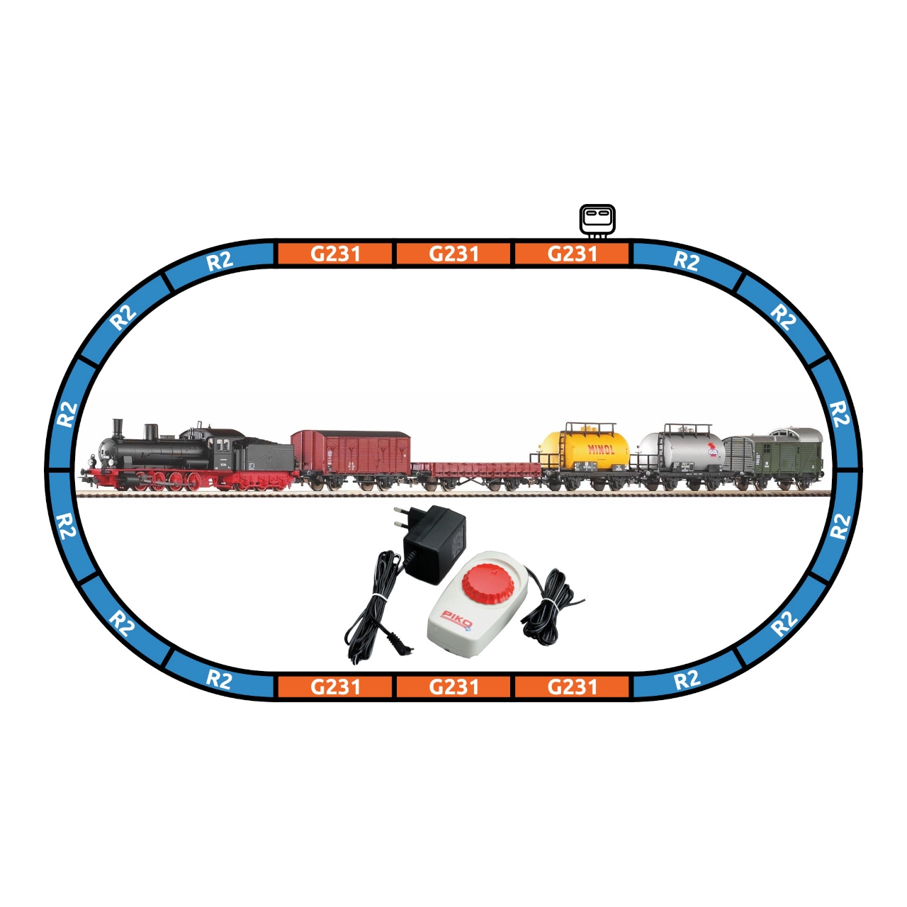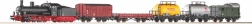 Parní lokomotiva BR 55 s tendrem, 5× nákladní vůz, 12× oblouk R2 s podložím (55412), 5× rovná G231 s podložím (55401), 1× rovná G231 s připojením napájení (55406), podložka pro svorku (55447), napájecí svorka (55270), základní analogový ovladač s napájecím zdrojem (55003)