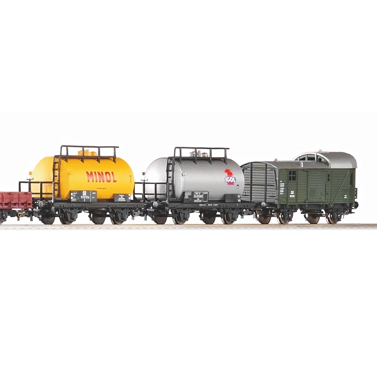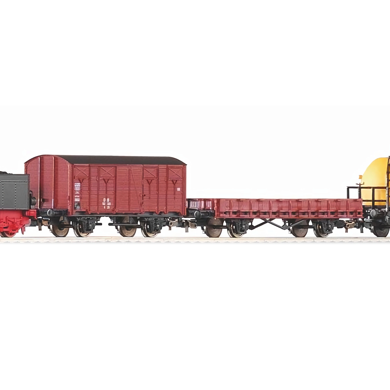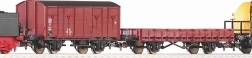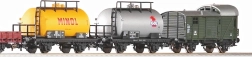 Souprava zahrnuje směsici nákladních vozů DB éry III – krytý vůz, plošinový vůz a cisterny – pro variabilní sestavy a realistické nákladní scénáře na vaší trati.