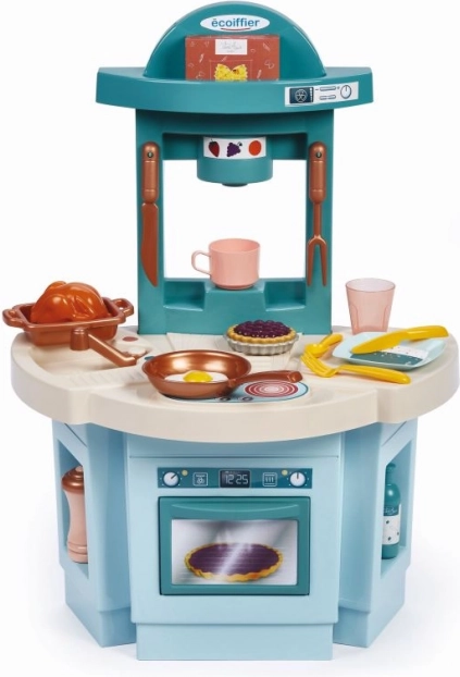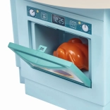 Azurová dětská kuchyňka pro malé kuchaře nabízí troubu, sporák se dvěma hořáky, dřez s kohoutkem a úložné police a háčky. Součástí je 18 doplňků včetně pánve s vejcem, pekáče s kuřetem či náčiní. Kompaktní rozměry 43,5 × 27 × 60 cm z ní dělají ideální kuchyňku do každého dětského pokoje.