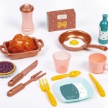 Součástí je 18 doplňků: pánev se sázeným vejcem, pekáč s kuřetem, náčiní na pečení, talíř s příbory, sklenice, hrnek, mlýnek na pepř, krabička na těstoviny, láhev vody a dortík.